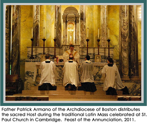 The return of the Church’s ancient liturgy to Harvard Square and to St. Paul’s, given these circumstances, therefore struck me as something almost miraculous. The feast day that marked the occasion, the Annunciation, fell on a Friday of Lent and therefore the simple and reverent service provided a fitting celebration. A visiting priest from the outer Boston suburbs, with the gracious welcome and assistance of Fr. Michael Drea, the current pastor, said a low Mass -- the simple form of the ancient liturgy that dispenses with the incense and the Gregorian chant that, in the minds of many, represent the hallmarks of the older ceremony. At low Mass, just like at any celebration according to the pre-conciliar rubrics, the priest does not face the congregation but rather joins them to focus in the direction of the altar. Since there is little singing in this sparer ceremony, much of the Mass is said in silence; but even in the grandest Sunday high Mass, the older rite emphasizes the sacred mystery as much by what the congregation does not hear as what it does. Most notably, the priest says, with the exception of a few words, the entire Roman canon -- which, unlike in the modern Mass, is the only Eucharistic prayer -- inaudibly. The silence is interrupted only by the bells that signal the consecration and the successive elevations of the Host and the Chalice. With similar reverence, communicants approach the altar, in contrast to the custom observed in nearly every parish church today, not to receive the sacred Host standing or in their hands, but kneeling at the communion rail in the posture of a supplicant. And at the end of every Mass, the priest reads the same selection from the beginning of St. John’s Gospel and all genuflect briefly at those familiar words from the Angelus -- et Verbum caro factum est; and the Word became flesh -- that commemorate the Incarnation.