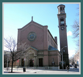 St. Paul Church sits amid campus a block from Harvard Yard on the corner of Bow and Arrow Streets. A massive red-brick edifice, done in Veronese Romanesque, with a campanile from whose height the bells toll each hour, it appears as a location visibly steeped in Catholic tradition. Inside, even, the remnants of an altar rail can still be descried and the sanctuary centers around the original marble high altar in the rear. The stained-glass windows that line the nave depict the great doctors of the Church -- Augustine, Aquinas, Anastasius, Anselm, Ignatius -- and on bas reliefs above the side doors is Saint Paul himself, on one side of the sanctuary, preaching to the philosophers of Athens and, on the other, burning the books of the magicians at Ephesus, a veiled reference to the once virulently anti-papist university up the street. An excellent boys choir, trained in the Boston Archdiocesan Choir School annexed to the parish, provides music for the principal Sunday Mass and most mornings during the week as well.
